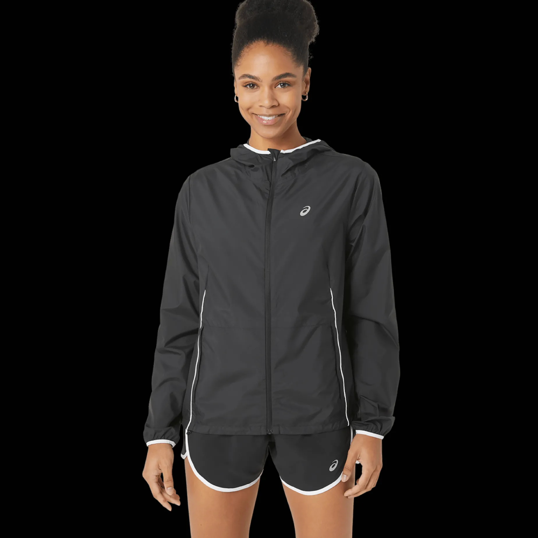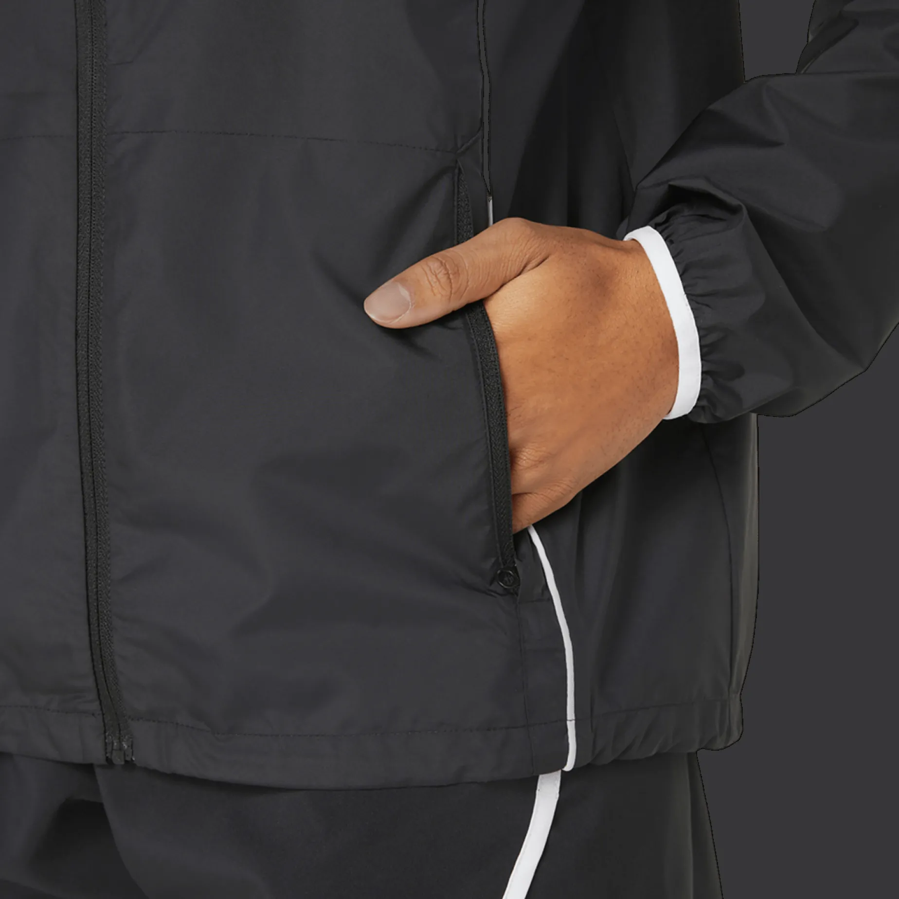 Med glidelåslommer på siden kan du oppbevare personlige eiendeler mens du er i aktivitet. Løpejakken kan pakkes sammen lommen for praktisk oppbevaring når jakken ikke brukes.