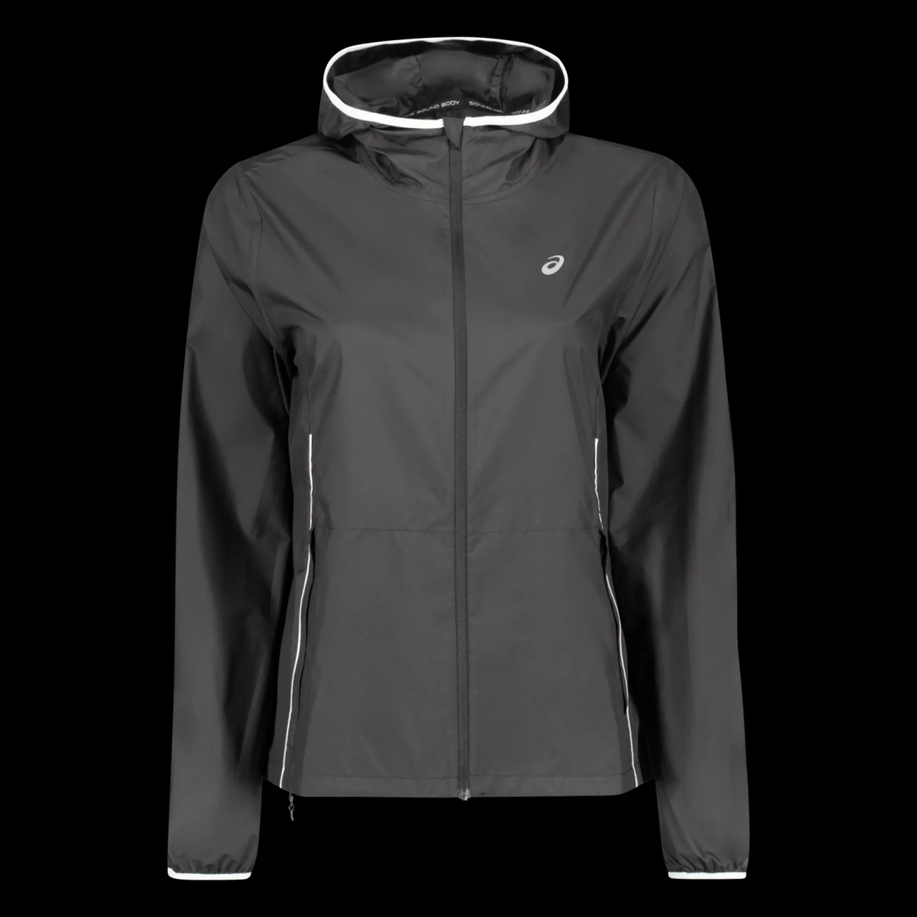 Komfortabel løpejakke med hette i vann- og vindavvisende materiale. Lommer for oppbevaring. Kan pakkes sammen i egen lomme. Justerbar snor i midjen. Reflekterende detaljer.
