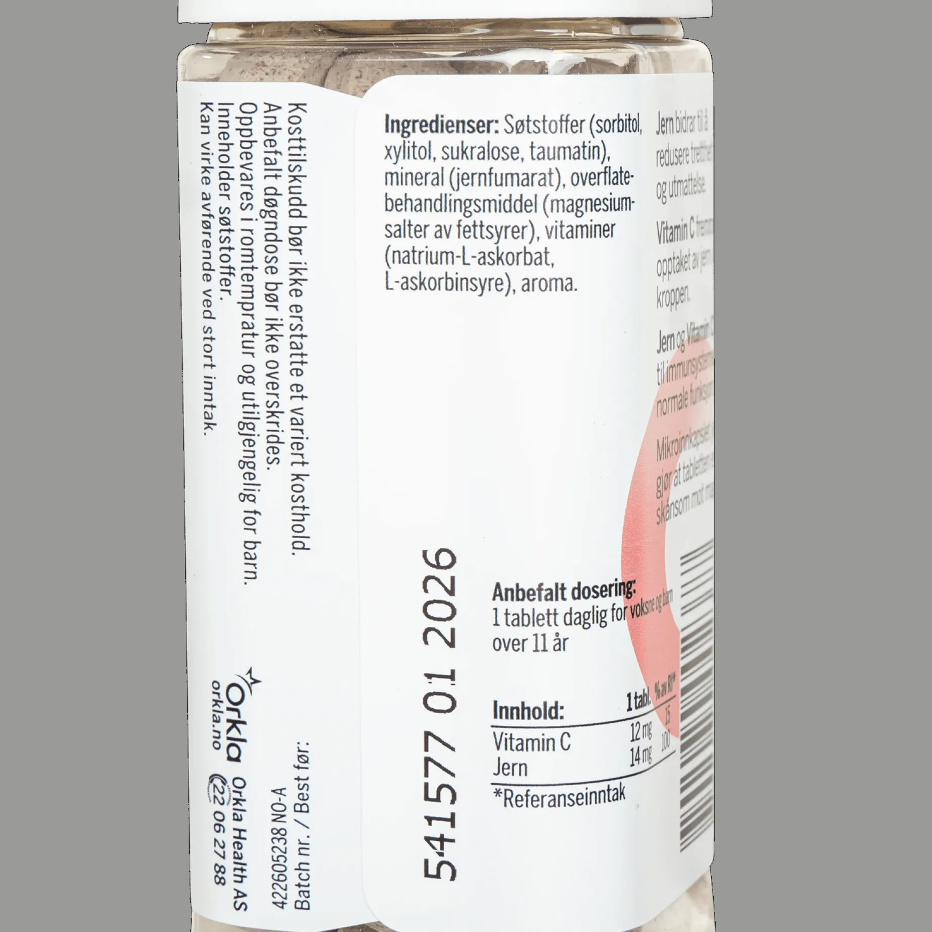 Tyggetabletten med jern-tilskudd med en frisk og god appelsinsmak. Har garantert ingen vond eller metallisk smak. Skånsom for magen. 75 stk i pakken.