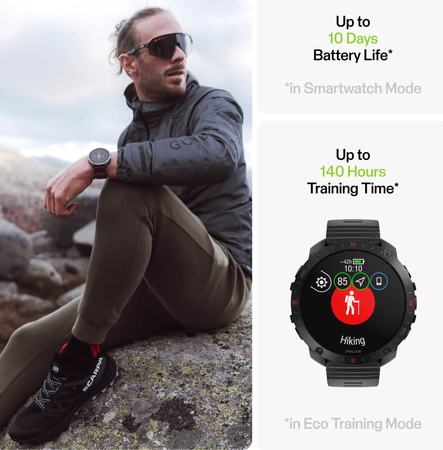 Røff og robust GPS-sportsklokke med høyoppløselig AMOLED-berøringsskjerm av safirkrystallglass. Trenings- og restitusjonsverktøy. Over 150 tilgjengelige sportsprofiler. Lang batterilevetid. Bluetooth-tilkobling. Lett og robust titan-hus. Vekt: 79 gram.
