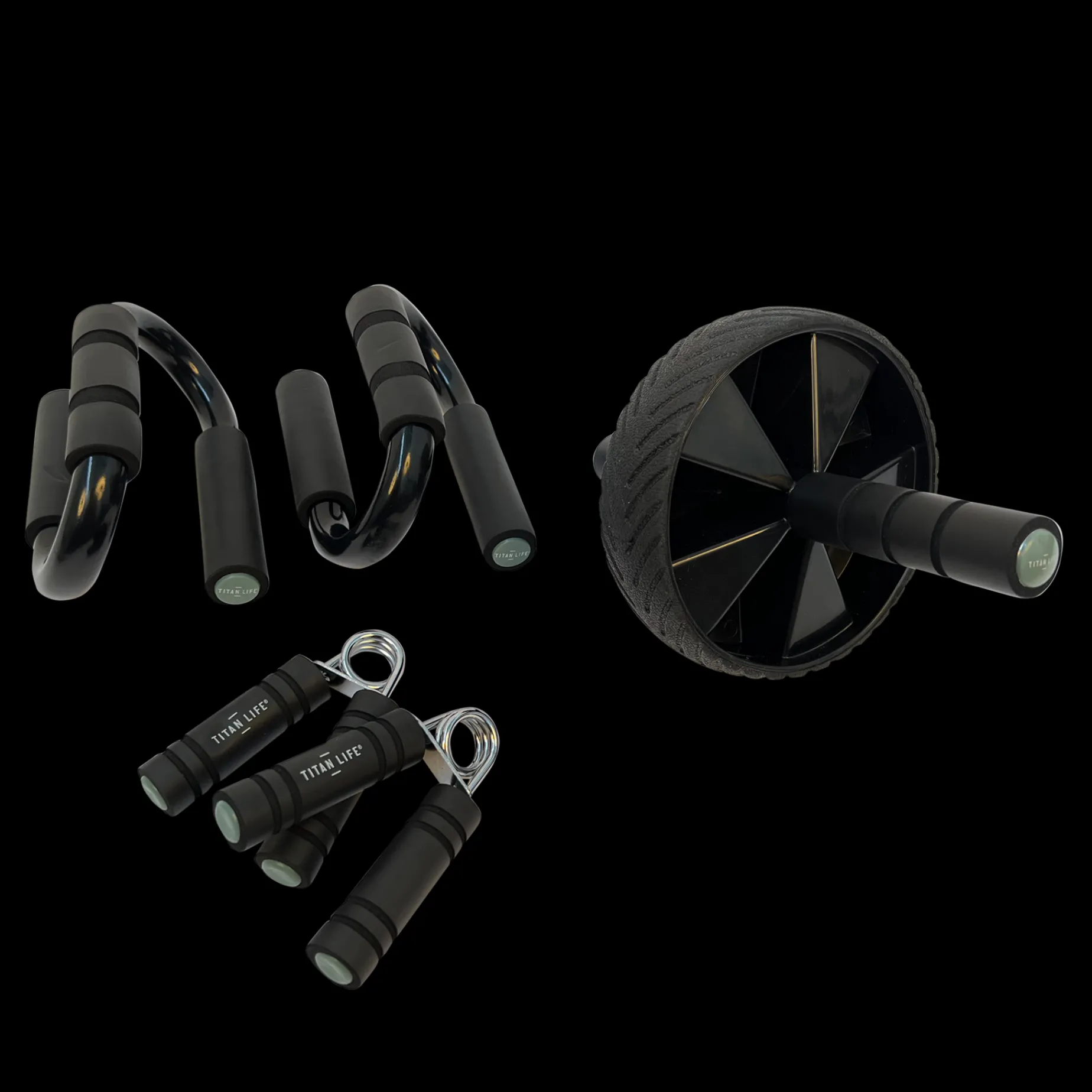 Titan Life – Strength Set er et sett med forskjellige deler av små hjemmetreningsutstyr. I pakken finner du et magehjul, push-up stang og handgrip.