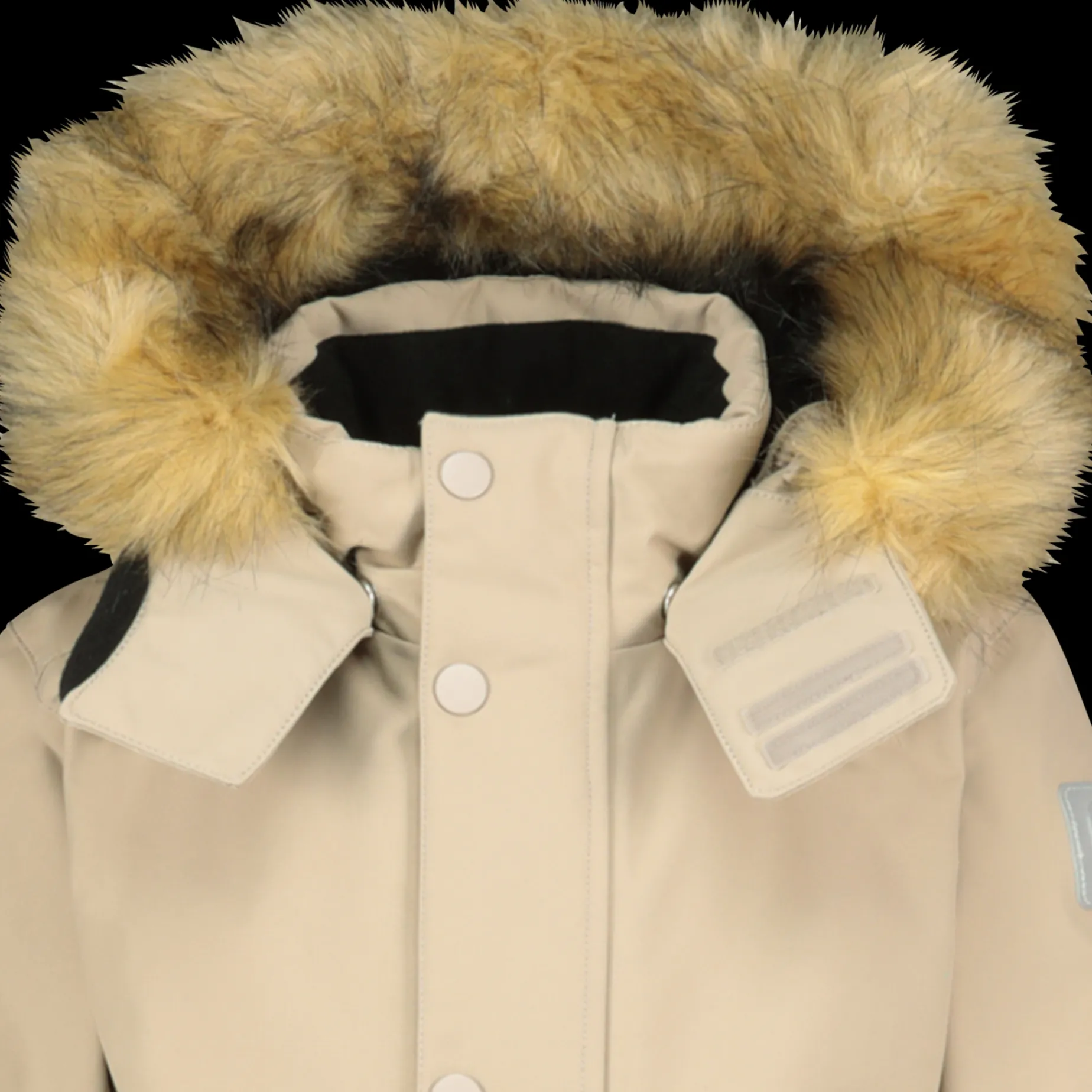 Avtakbar hette som beskytter godt mot vær og vind. Den er festet med trykknapper og løsner lett hvis den skulle hekte seg fast i noe, – og er derfor trygg når barnet leker ute.