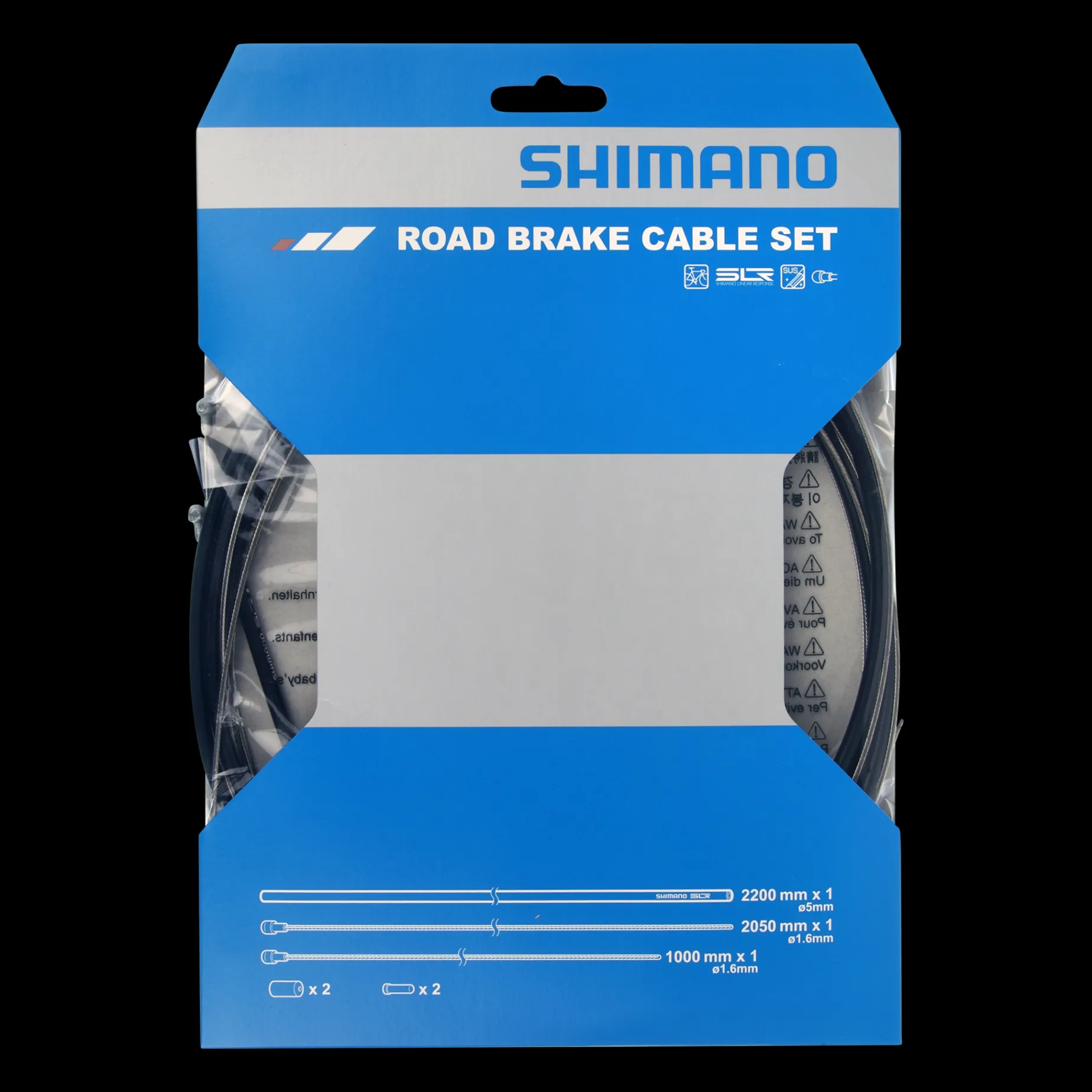Shimano Road Brake Cable Set leveres med 1 x 1000 mm og 1 x 2050 mm vaiere, samt én 5 mm strømpe på 2200 mm. Alle endehetter medfølger. Vaierstrømpene er foret med en mantel av polymer, for å gi vaierne bedre glid.