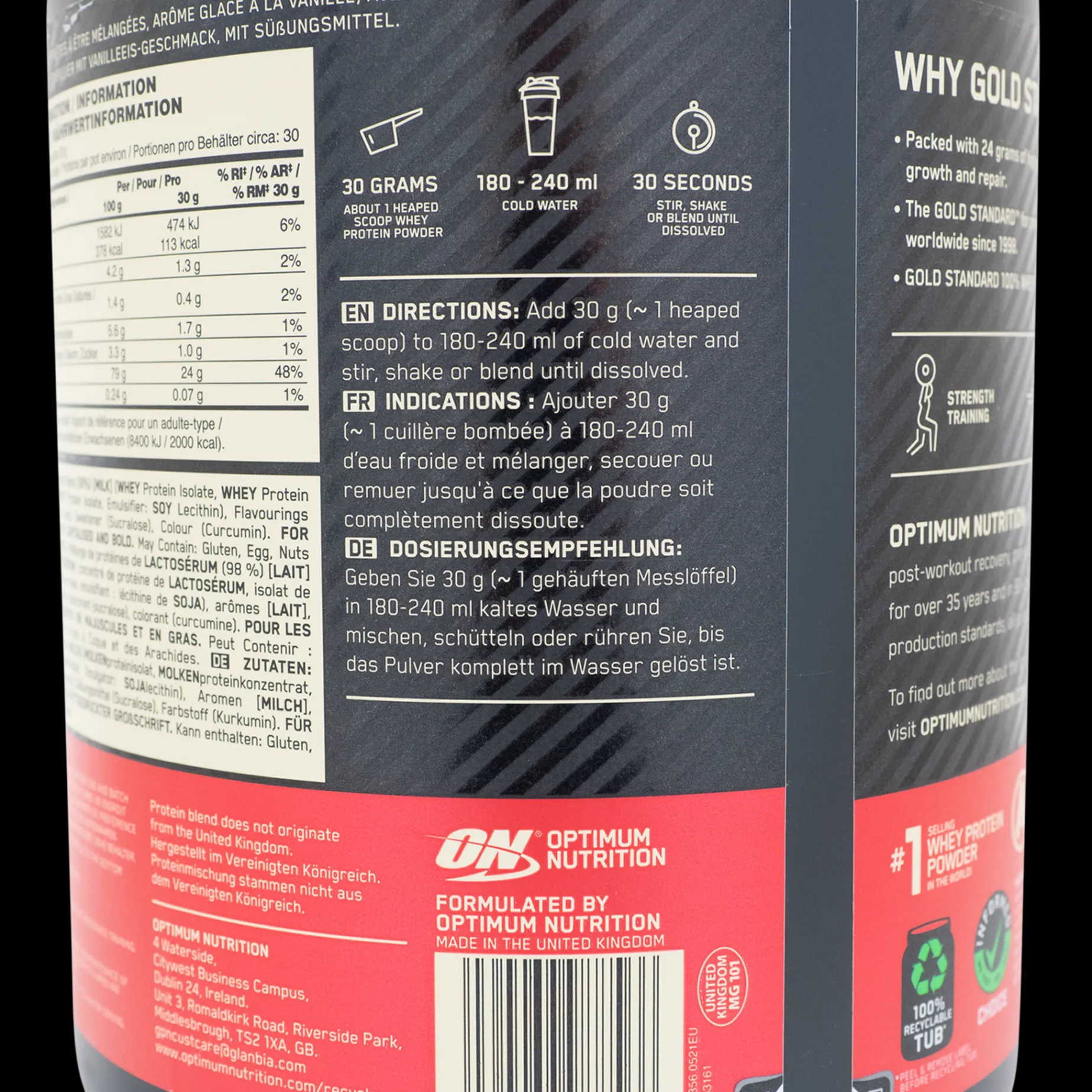100 % Whey Gold Standard er et av verdens mest populære proteinpulver. Det har en formel som får det til å løse seg svært lett opp i væske, slik at du slipper klumper i shaken.