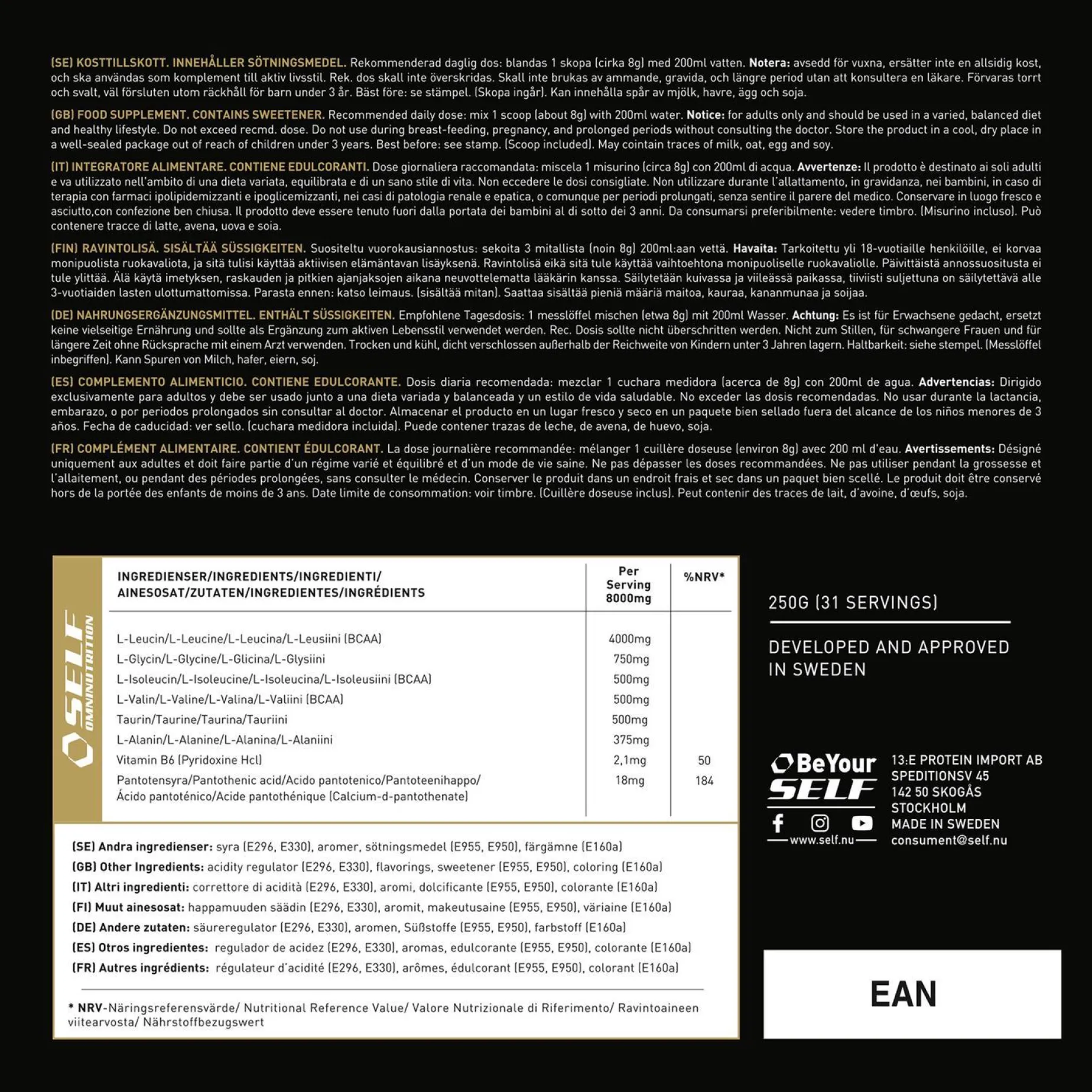 Velsmakende kosttilskudd med 8:1:1-forhold av L-leucin, L-Valin og L-Isoleucin. Lettoppløselig og god smak av appelsin. Uten sukker og karbohydrater. Glutenfri.