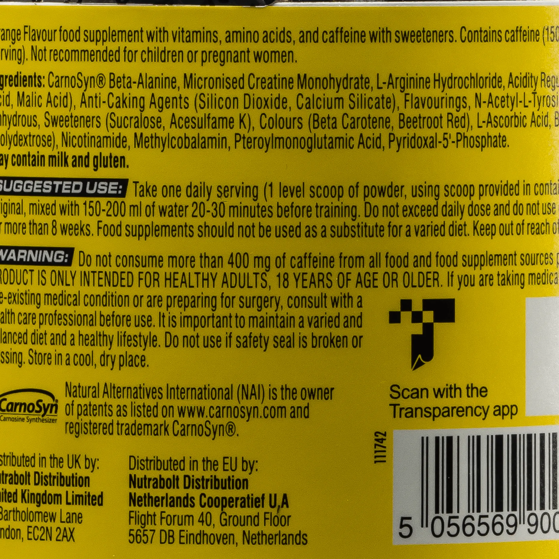 Ingredienser: Kreatin og OxyStorm® nitratblanding (kreatin monohydrat og Ocystorm®, rød spinatekstrakt (Amaranthus hypochondriacus) (standardisert for nitrater)), CarnoSyn® (Beta-alanin), Arginin alpha-ketglutarat, surhetsregulerende middel (sitronsyre), aroma, N-Acetyl-L-Tyrosin, Vvannfritt koffein, polydekstrose, søtningsmiddel, (Acesulfam kalium, Sukralos), Vitaminer (Askorbinsyra, Folsyra, Pyridoxin hydroklorid, Methylkobalamin), klumpförebyggande medel (Kiseldioxid, Kalciumsilikat), farge (E133; Blue Raspberry, Green Apple), E129 (Fruit Punch & Watermelon), E102 (Green Apple).