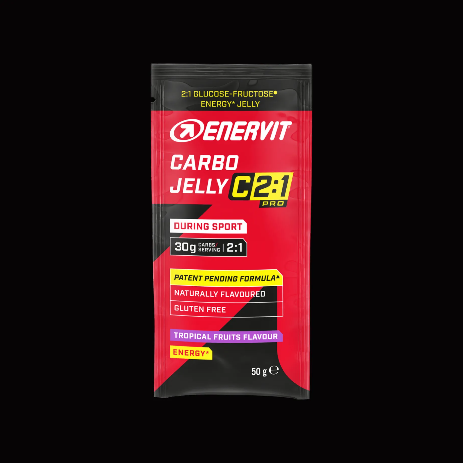 Enervit C2:1 Carbo Jelly 50g er tyggbar gelè som gir deg glukose og fruktose i forholdet 2:1 og 30 gram karbohydrater.