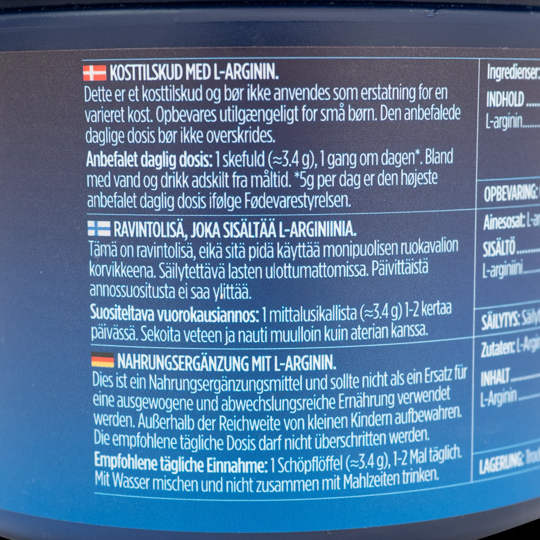 – Ingredienser: L-arginin, antiklumpemiddel