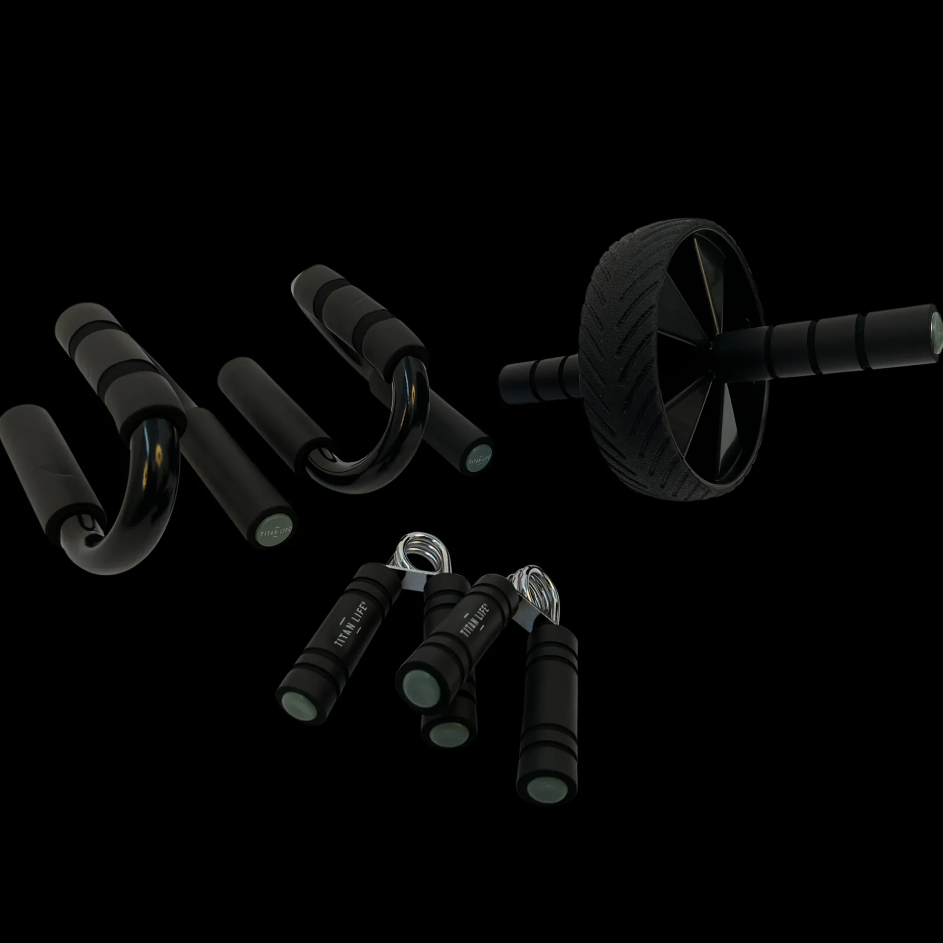 Titan Life – Strength Set er et sett med forskjellige deler av små hjemmetreningsutstyr. I pakken finner du et magehjul, push-up stang og handgrip.