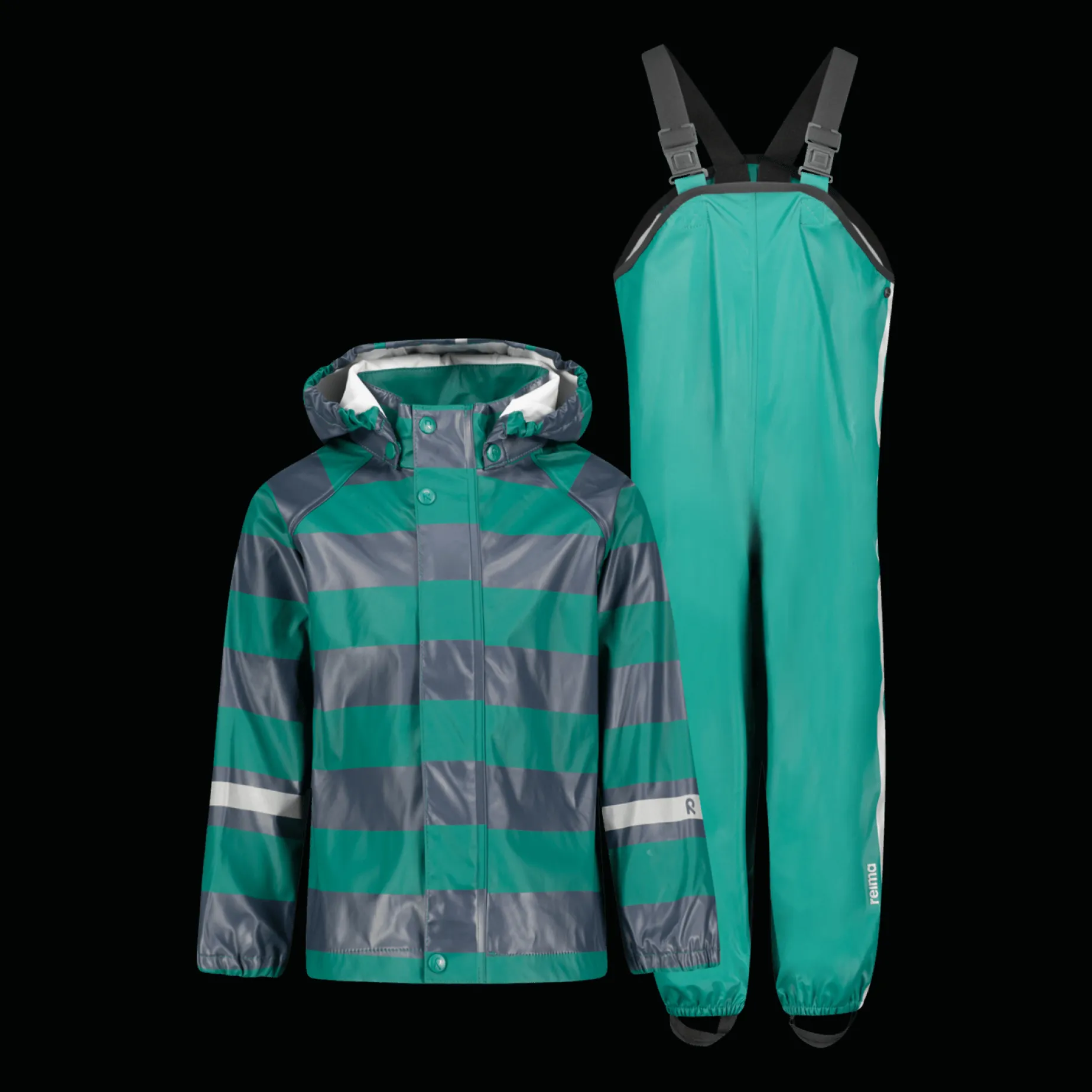 Funksjonelt regnsett i vann- og vindtett materiale med sveisede sømmer (vannsøyle: 10.000 mm). Avtakbar hette. Elastiske seler, mansjetter og linning. Reflekterende detaljer.