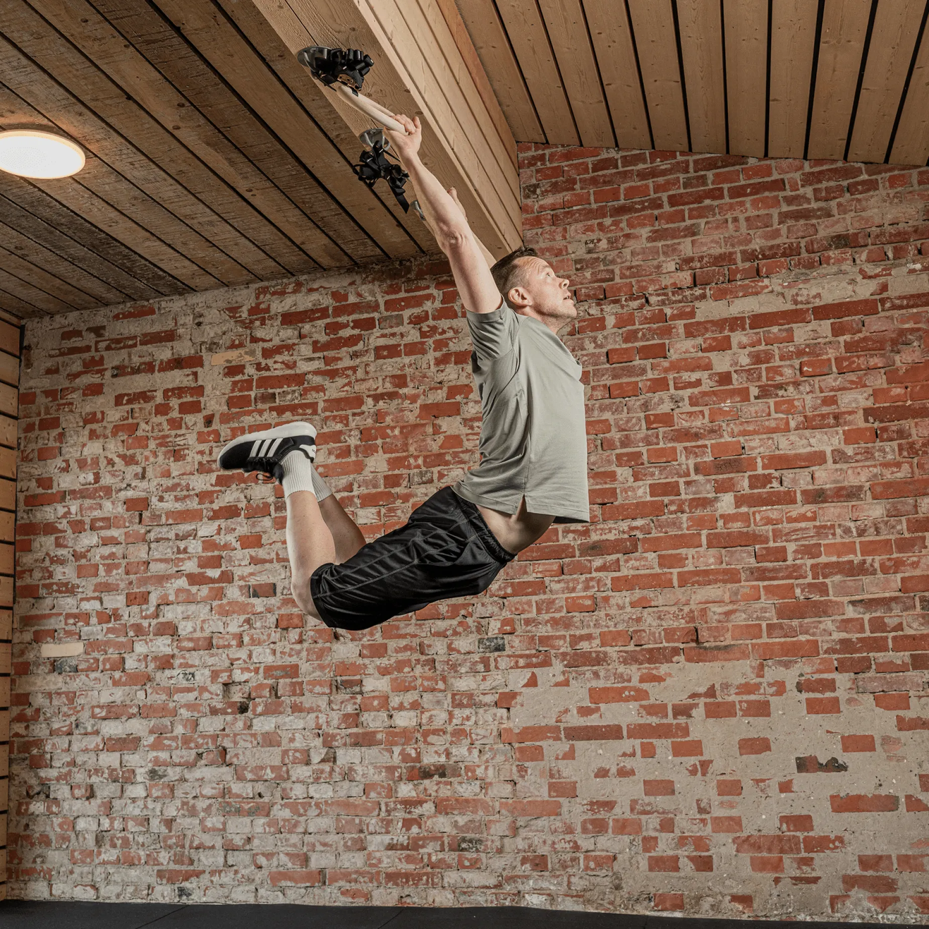 Gymringer produsert i sterkt treverk testet til maksimalt 300 kg. Stropper på 4,5 m er enkle å montere. Ideelt til å trene pull-ups og push-ups.